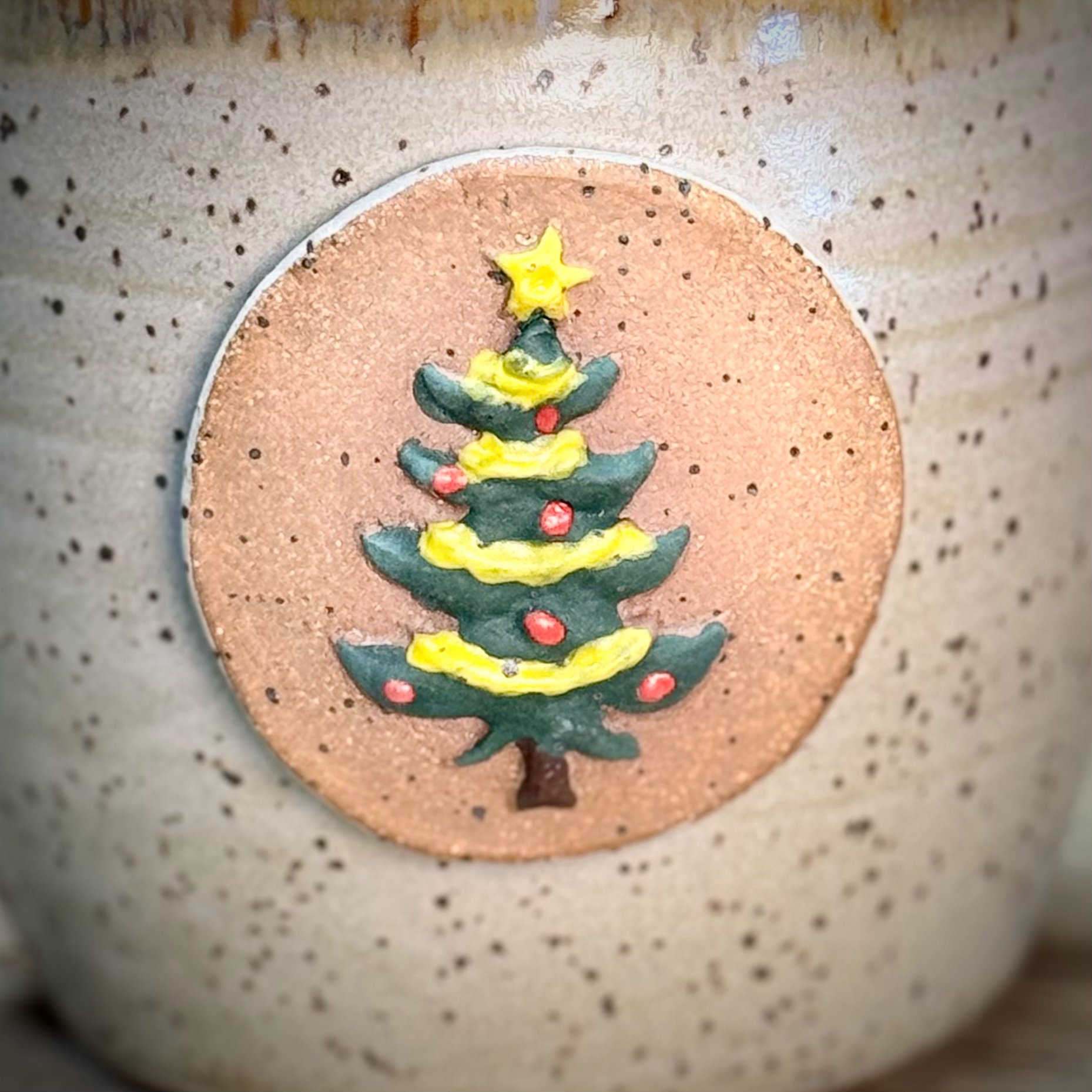 'Tis the Season! This lovely Christmas Tree embossed mug is sure to put you in the Holiday spirit! Hand thrown of stoneware clay, this mug stands at 4" tall and holds 15 oz. of your favorite hot or cold Holiday beverage. Brighten up your darkest winter nights with a bit of Holiday cheer in a beautifully handcrafted mug, and support this independent family operation in the process!