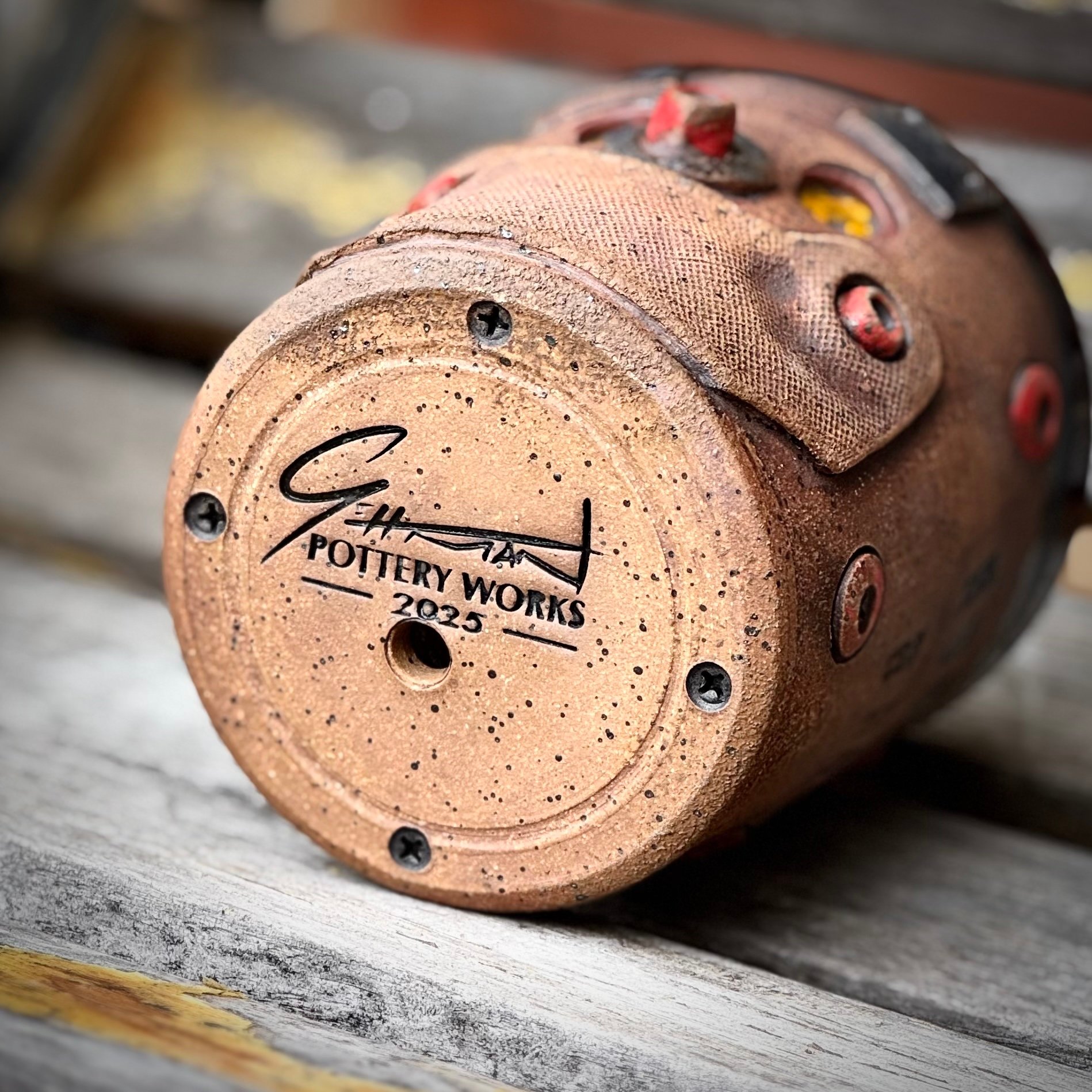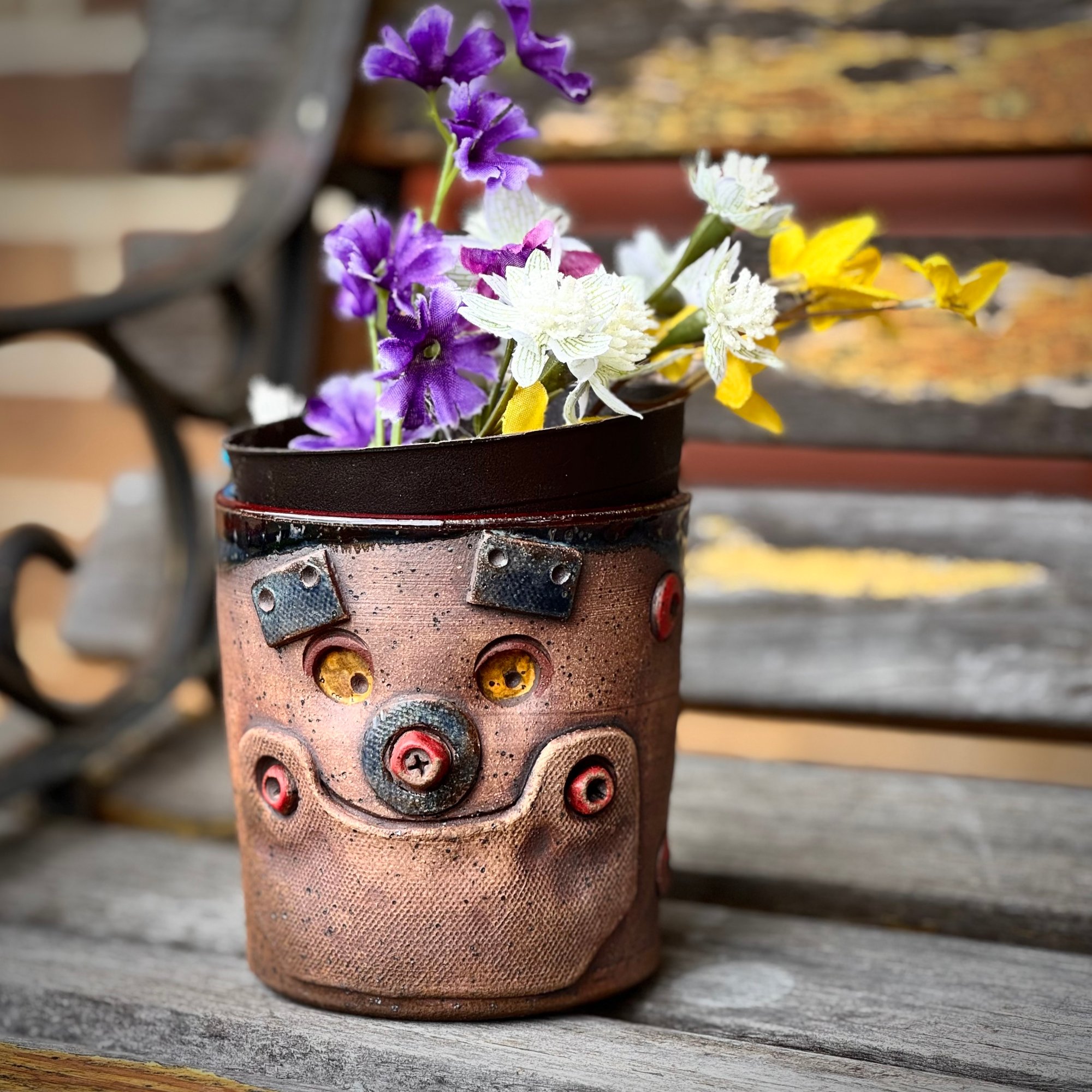 This whimsical little hand-thrown, hand-sculpted flower pot has the face of a robot who has seen a thing or two in its days. Sporting a grungy rusted look, yet still smiling about life, this little guy is sure to bring a smile to your day and be the topic of conversation when guests come over. Standing at just under 4"