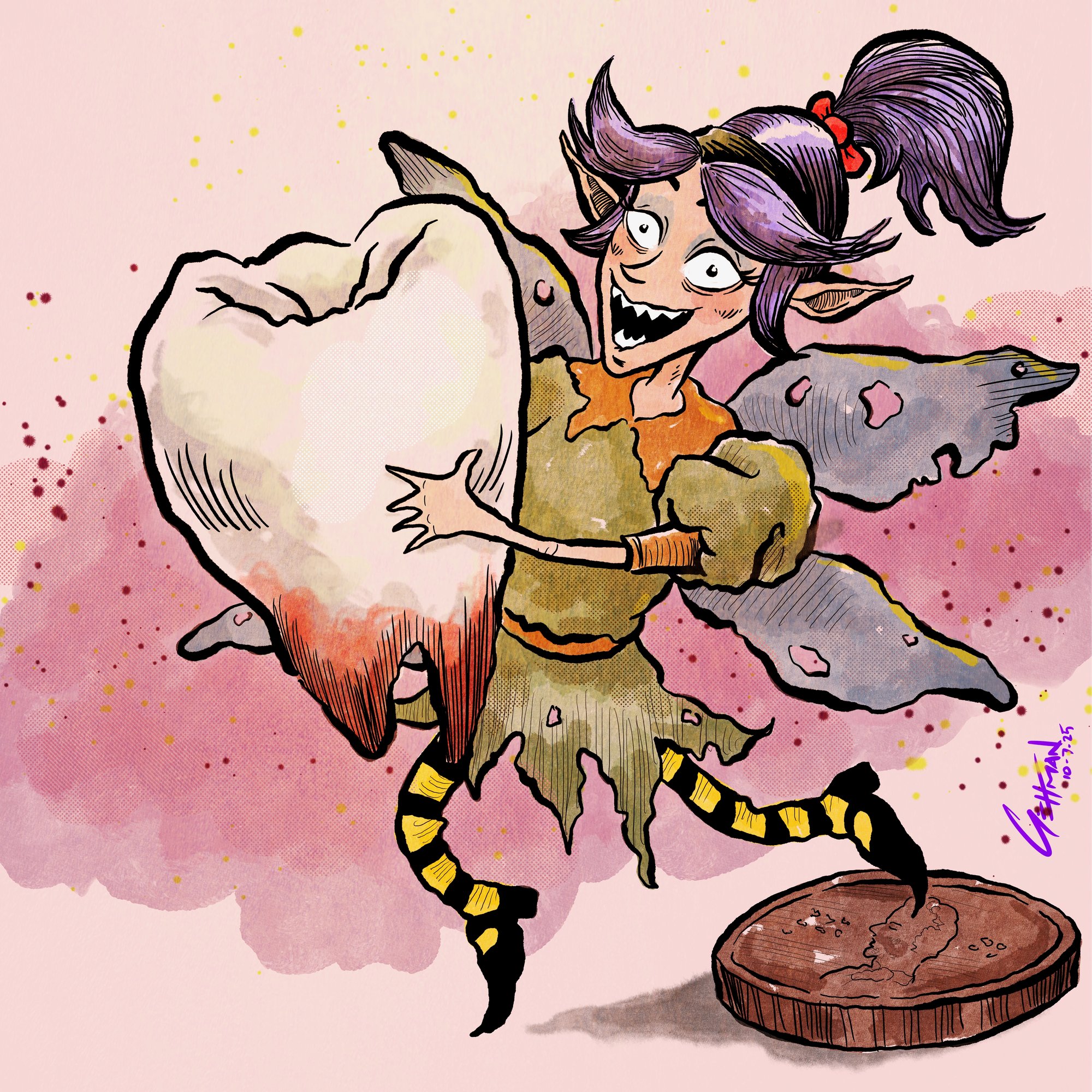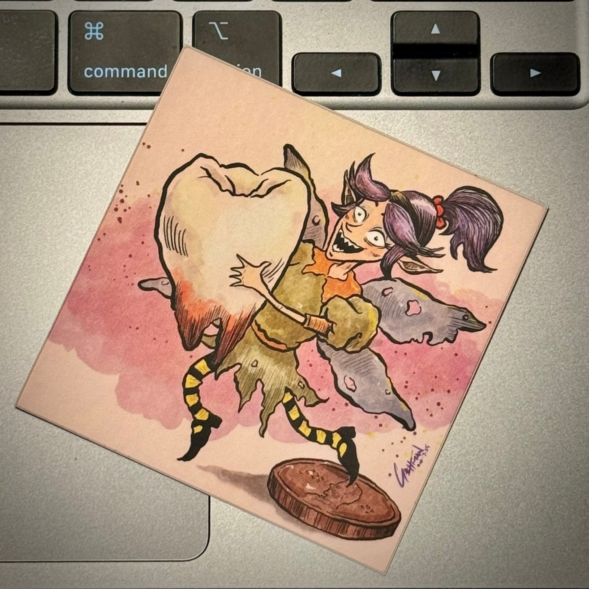 This 3"x3" vinyl sticker features a drawing by me (Brooke Gehman). This artwork was part of my annual October Drawing Challenge (Fairy was Day 7). The prompt for this day was 'Fairy' and the idea of a crazed tooth fairy stuck in the past when pennies were actually worth something sprung to ming!