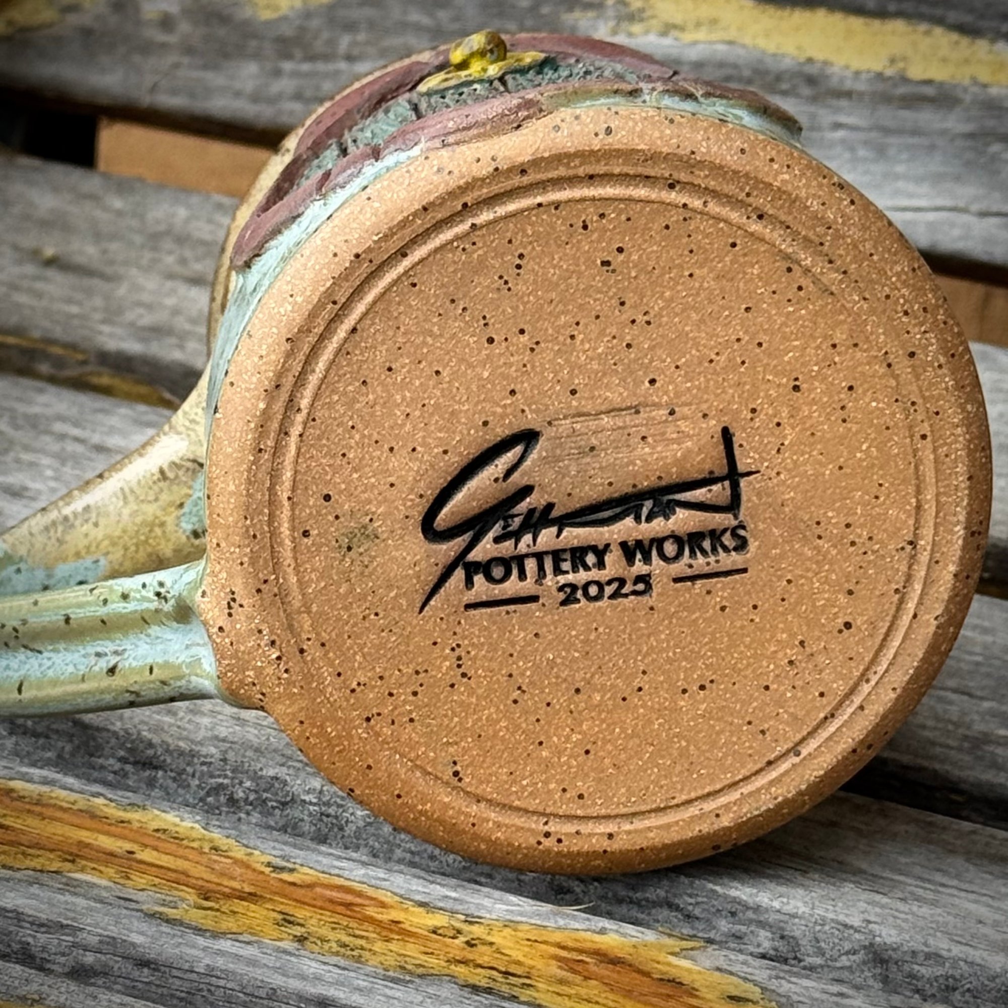 This mug was thrown on the wheel and then clay was added, sculpted and carved to make the door. Each piece is one of a kind.