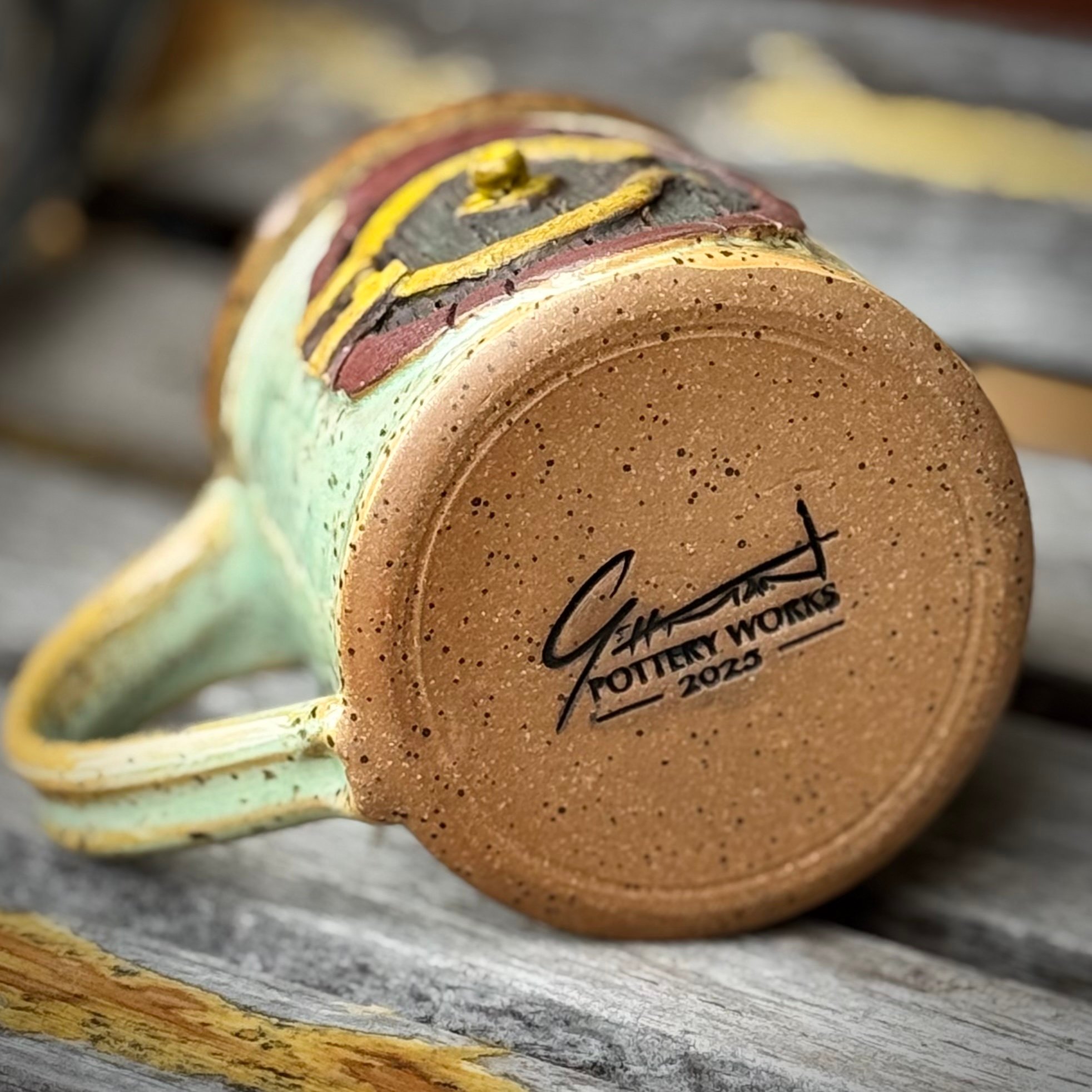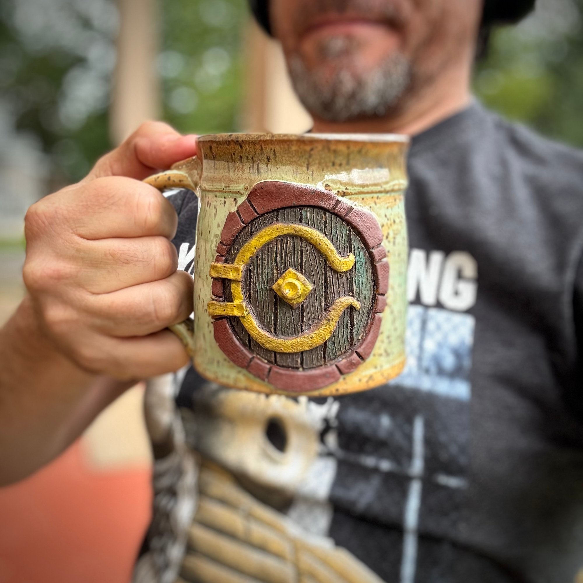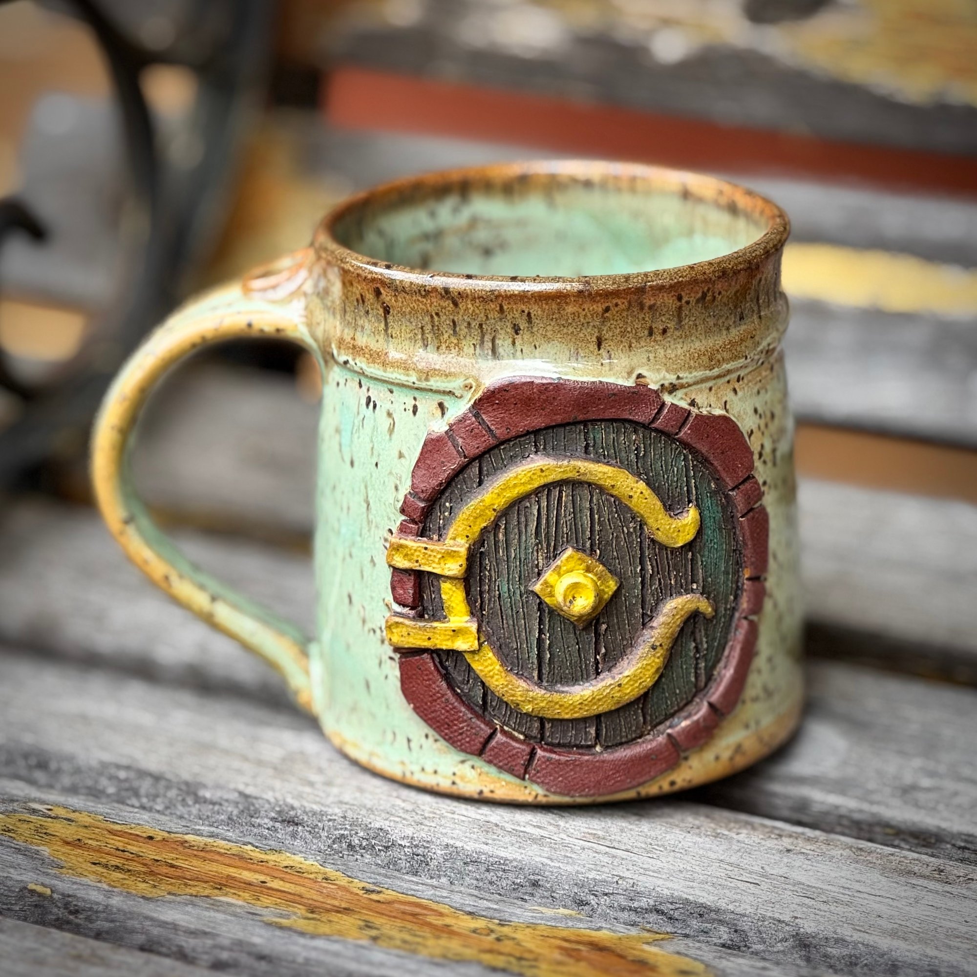 In a hole in the ground...well, you know the rest. This ornately hand-carved, hand-thrown mug will whisk you away to a faraway land of fantasy and adventure and is sure to liven up your morning cup of coffee, tea, or maybe your evening ale. The mug stands just over 4 inches tall and holds over 16 oz if your favorite hot or cold beverage.