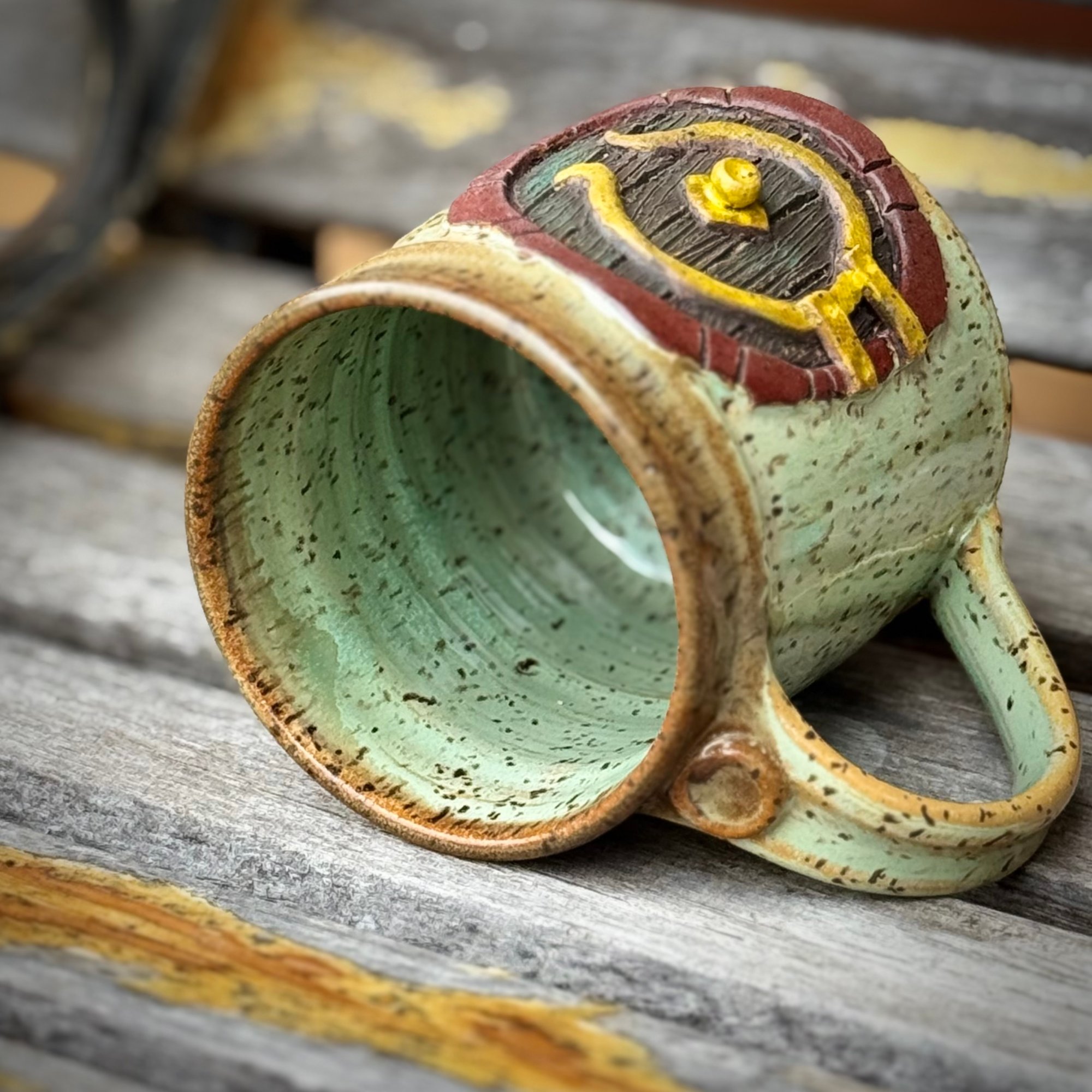 This mug was thrown on the wheel and then clay was added, sculpted and carved to make the door. Each piece is one of a kind.