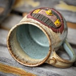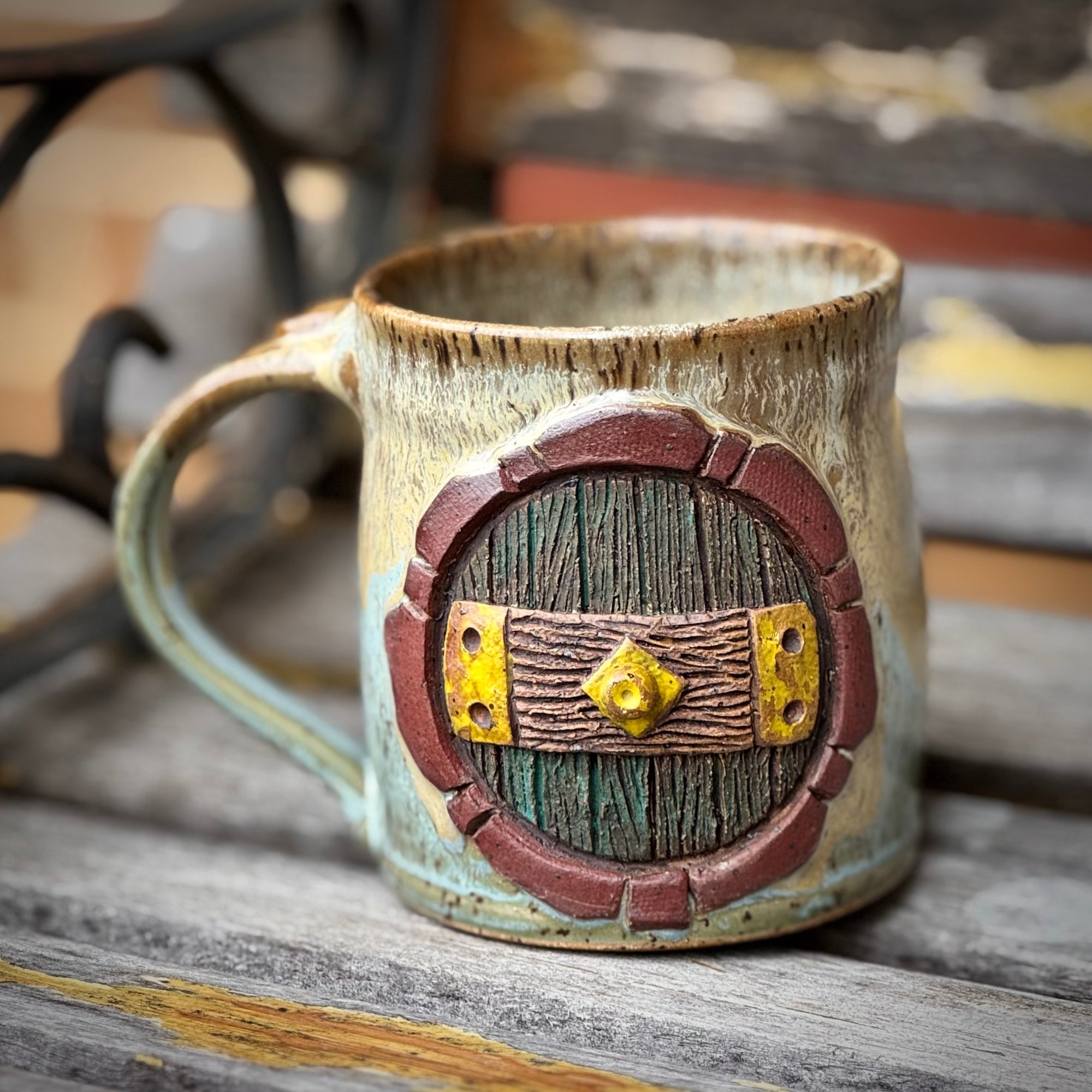 In a hole in the ground...well, you know the rest. This ornately hand-carved, hand-thrown mug will whisk you away to a faraway land of fantasy and adventure and is sure to liven up your morning cup of coffee, tea, or maybe your evening ale. The mug stands just over 4 inches tall and holds over 16 oz if your favorite hot or cold beverage.
