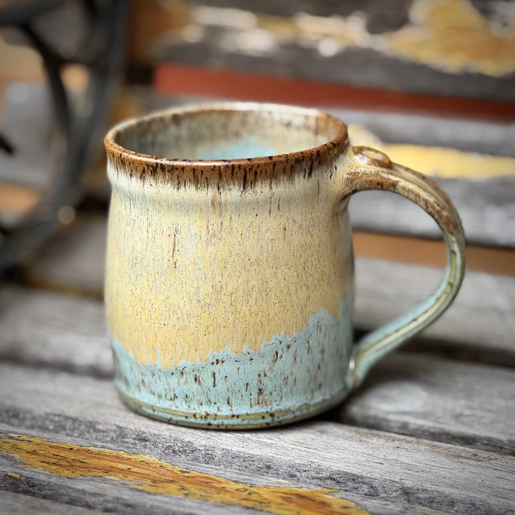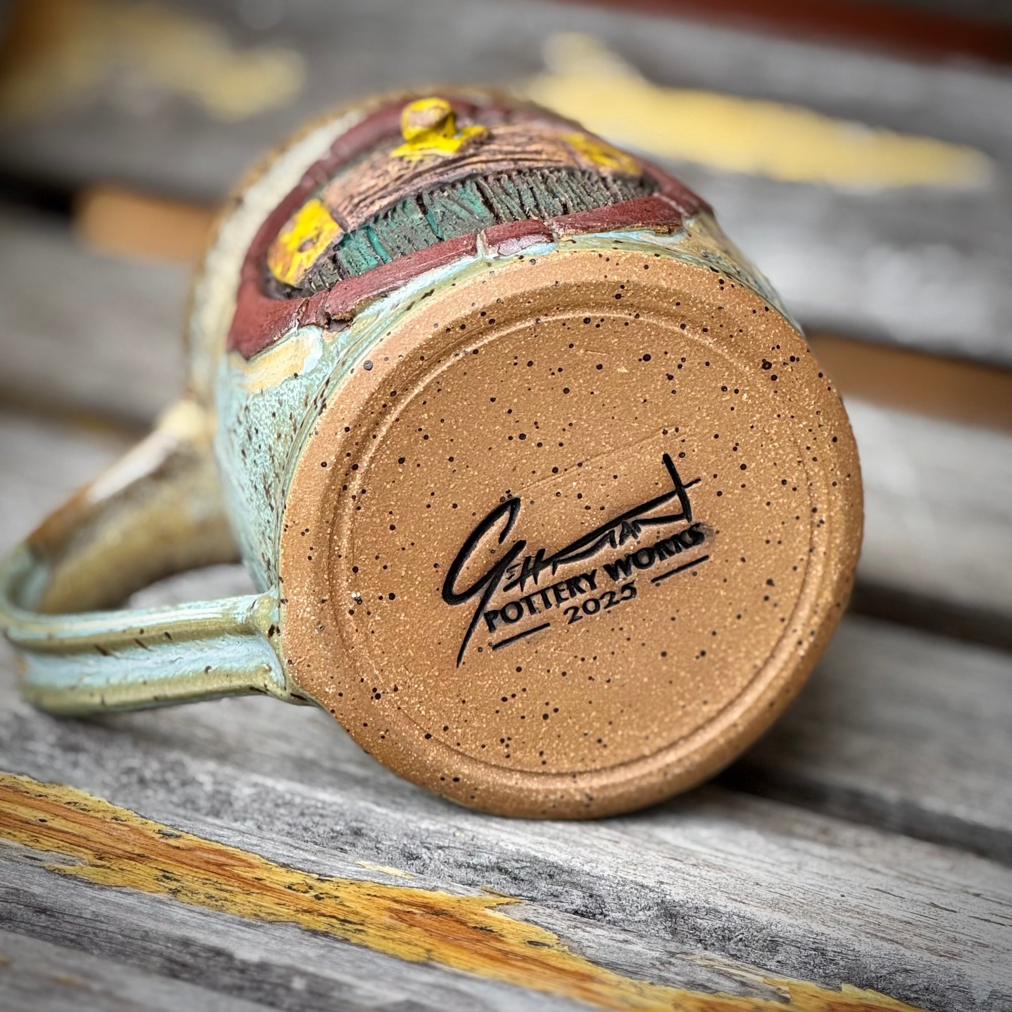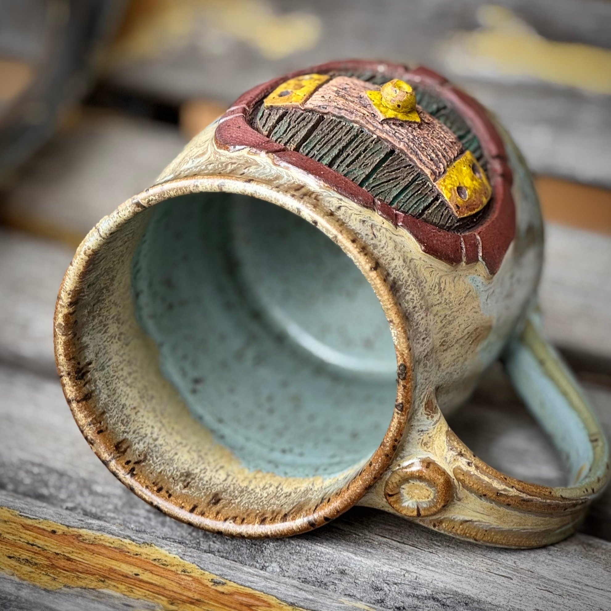 This mug was thrown on the wheel and then clay was added, sculpted and carved to make the door. Each piece is one of a kind.