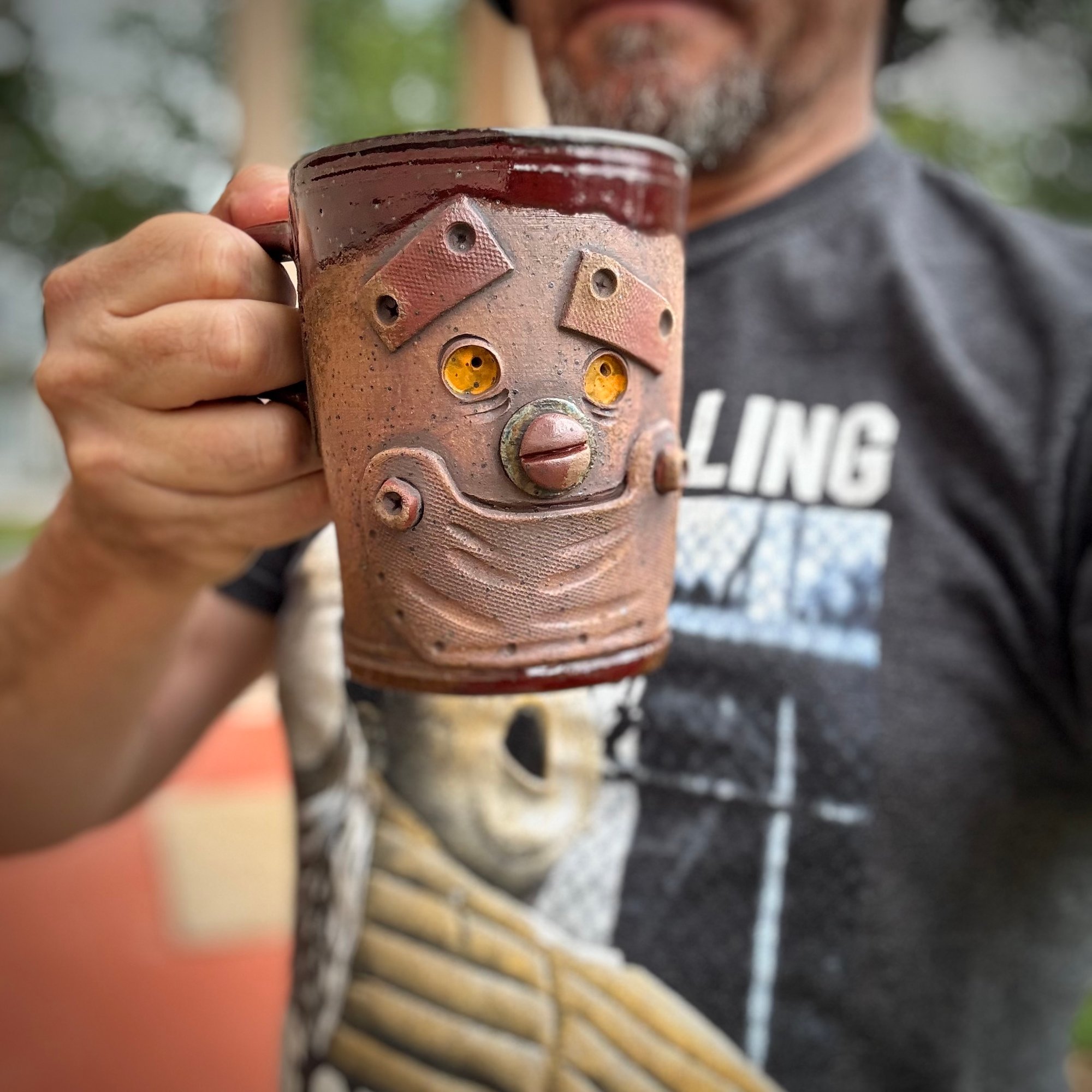 This little Robot Face Mug has just the right amount of grungey rust-looking patina to add charm and whimsy to your daily routine! Standing at just under 5" tall and holding 16 oz of your favorite hot or cold beverage, this is sure to be your new favorite conversation starter!
