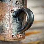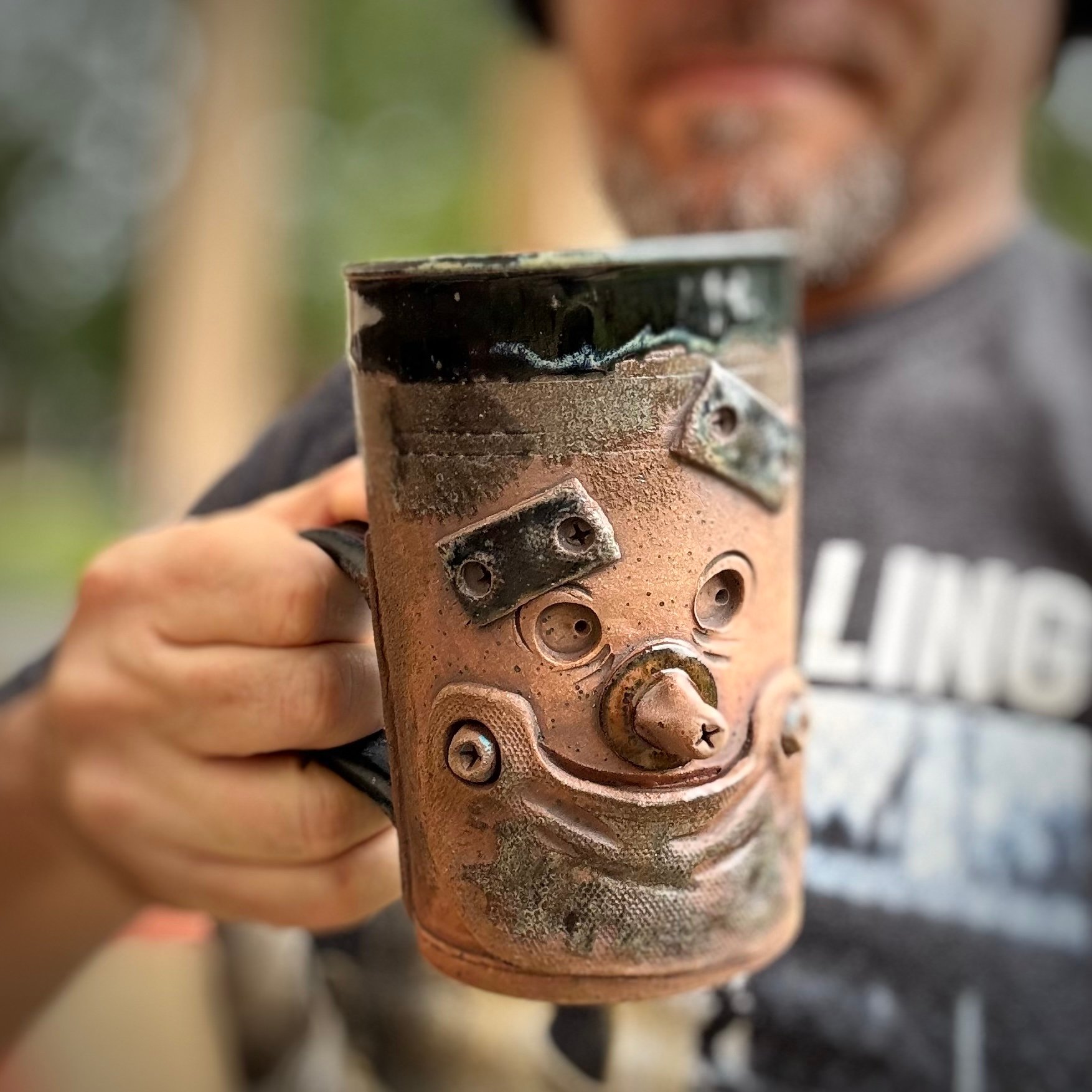 This stoneware mug is hand-thrown and hand-sculpted to look like metal. The details, down to the 'screws' holding the pieces together are crafted with love and attention and sure to make your day just a bit brighter! Standing at just over 5" and holding 16 oz. of your favorite hot or cold beverage, this mug could just be your new best friend!