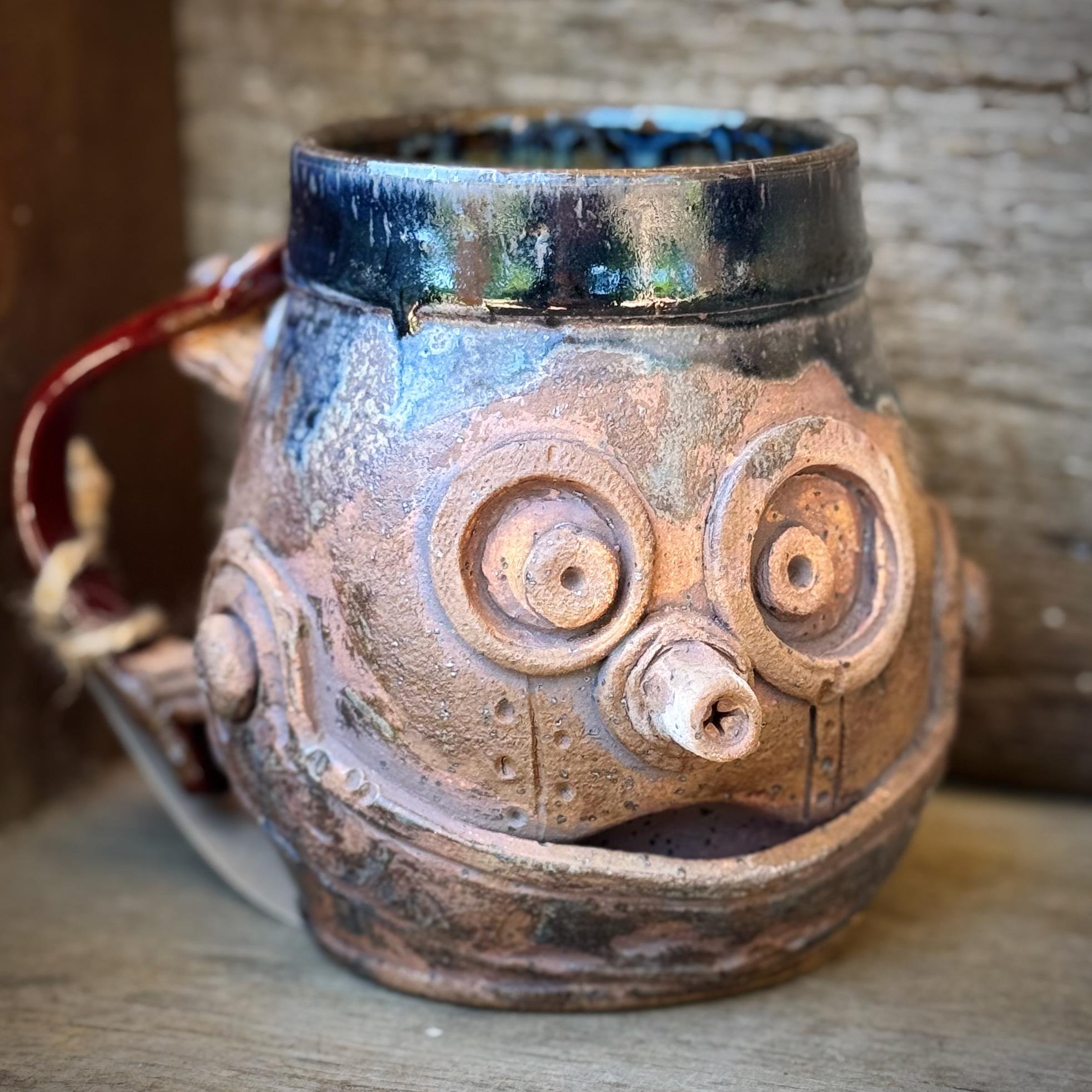 This Handmade Robot face mug is made to look like it's been rusting in the elements for many years. Holding around 16 oz. of your favorite hot or cold beverages, this metallic little guy is sure to bring a smile to your daily routine!